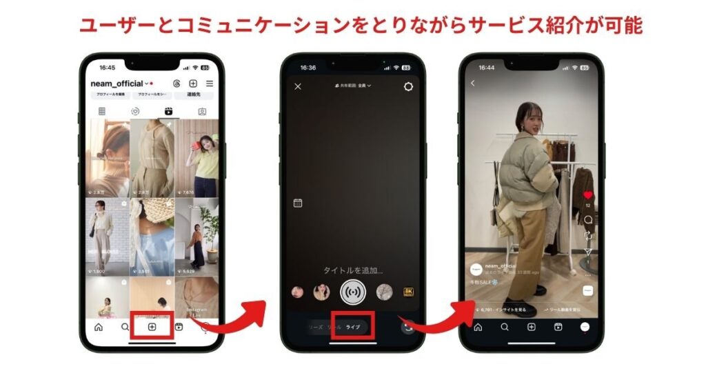 インスタライブは、Instagramのなかでもユーザーとのリアルタイムなコミュニケーションができる機能であり、フォロワーとの信頼関係を深めながらブランドの世界観を伝える場として活用されています。